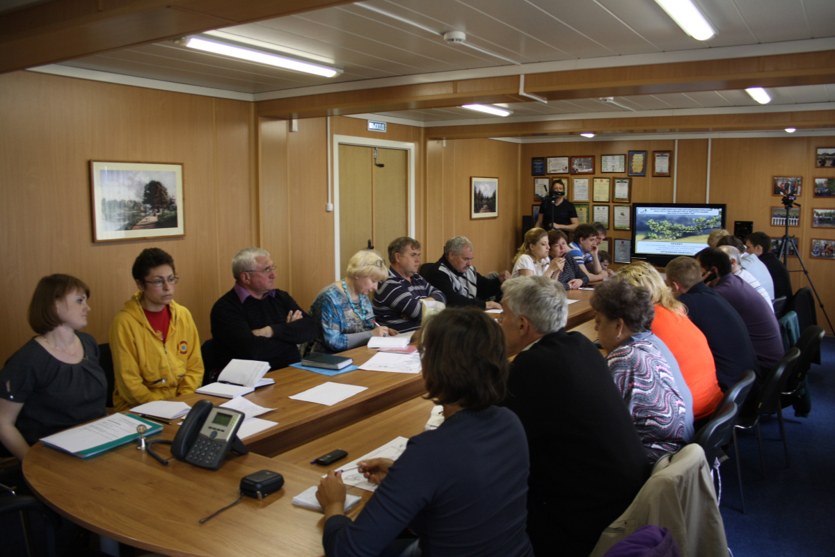 На совещании был заслушан доклады: заведующего лабораторией радиационной экологии леса ФБУ ВНИИЛМ Д. Ромашкина и В. Шараповой, начальника отдела лесоводства ГКУ г. Москвы «Дирекция ДПиООС» о формировании состава древостоя на территории парка. Член рабочей группы, общественный экологический контролёр при ДПиООС Е. Тартынская подняла вопрос об устройстве луговых газонов вместо запланированных обыкновенных. В. Шарапова ответила, что данный вид газонов будет расположен в небольшом объёме возле детской площадки, где луговой газон не сможет существовать в условиях высокой нагрузки. На остальной территории планируется устройство луговых газонов. Мероприятия по формированию состава древостоев были приняты единогласно.