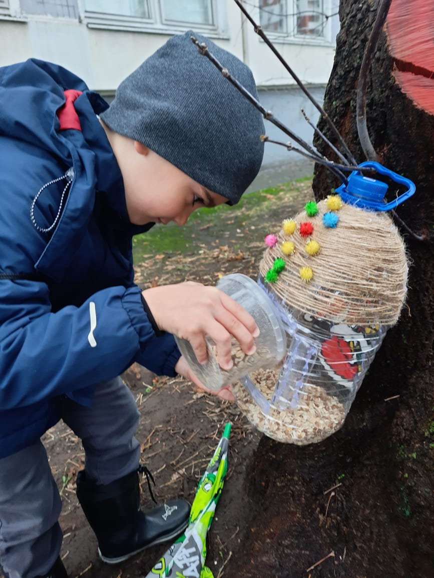 После лекции школьники вышли на улицу, чтобы развесить специально подготовленные кормушки возле школы. Эти кормушки, наполненные кормом, обеспечат птицам дополнительное питание зимой, когда естественный корм становится менее доступным.