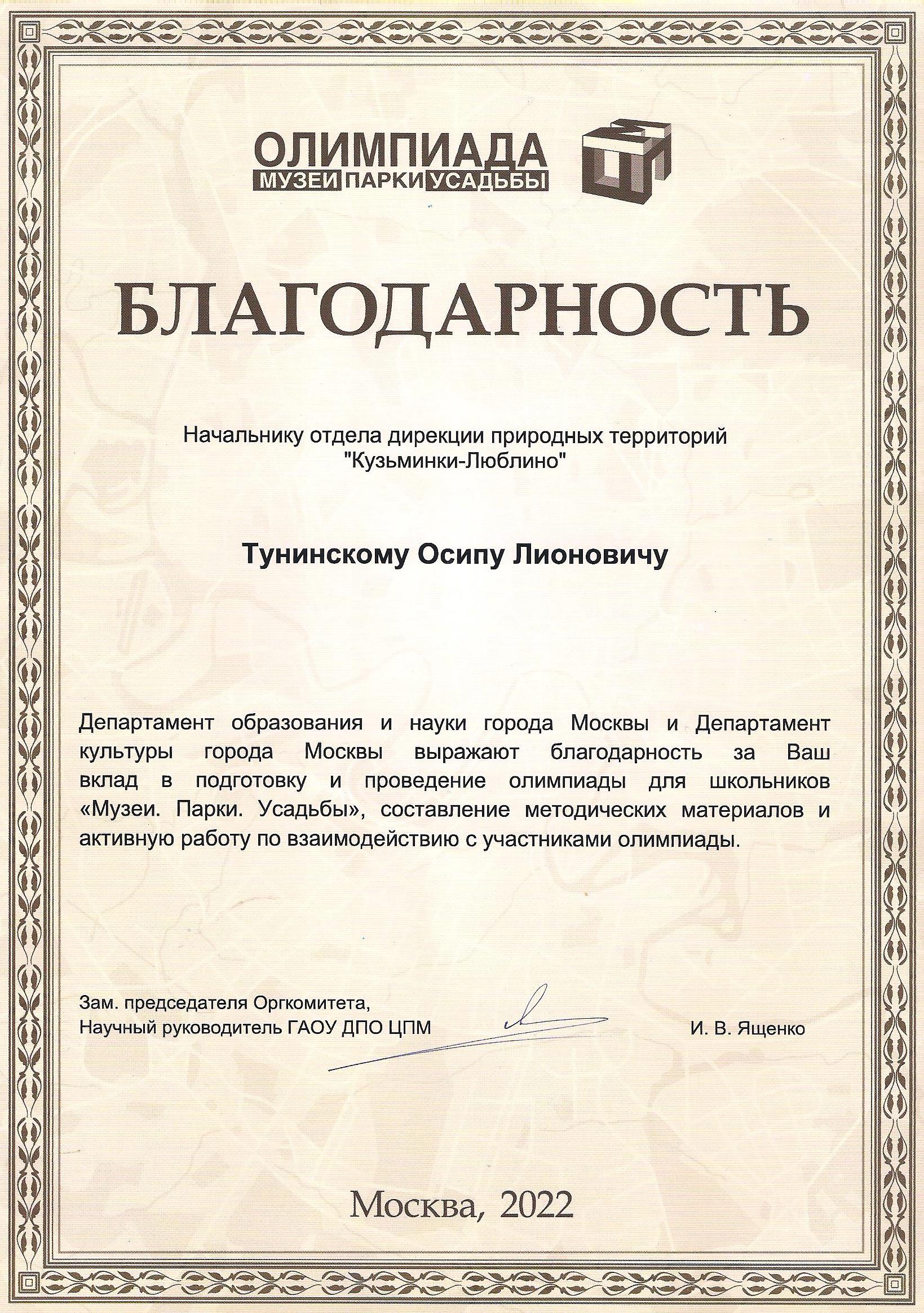 Начальнику отдела природных территорий «Кузьминки-Люблино» Тунинскому Осипу Лионовичу