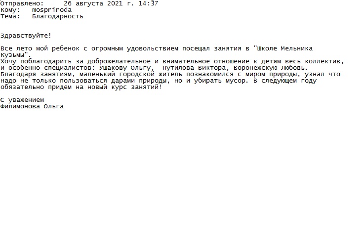 От Ольги Филимоновой за работу Зеленой школы мельника Кузьмы